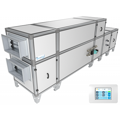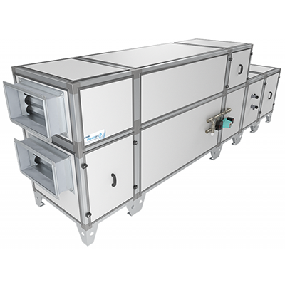 - Приточно-вытяжная установка напольного типа с противоточным пластинчатым рекуператором, системой защиты от замерзания, эффективный рабочий температурный диапазон до -35°С.